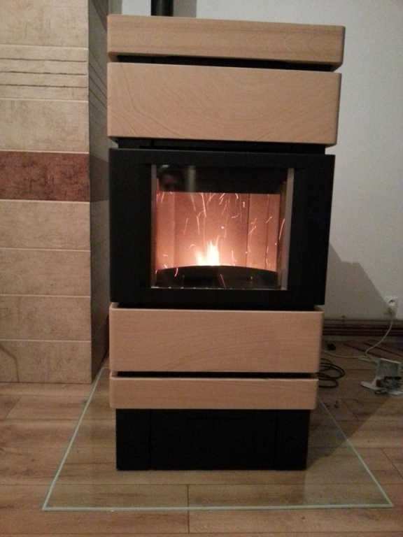 Interiérový kotol VARIO AquaObklad pieskovec. Tzv. kotolňa v obývačke. Rodinný dom cca 180 m2 . Kotol VARIO Aqua zabezpečuje teplú užitkovú vodu + podlahové kúrenie (palivo kombinácia drevo-pelety). Vytvára dva samostatné okruhy.